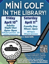 On April 10th and 11th, the library is transforming into a mini golf course and you will have the chance to golf in the stacks! We are thrilled to have several incredible local businesses sponsoring the event. Please join us for some mini golf and fun all while supporting the library!